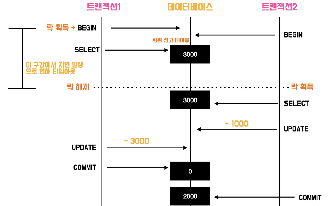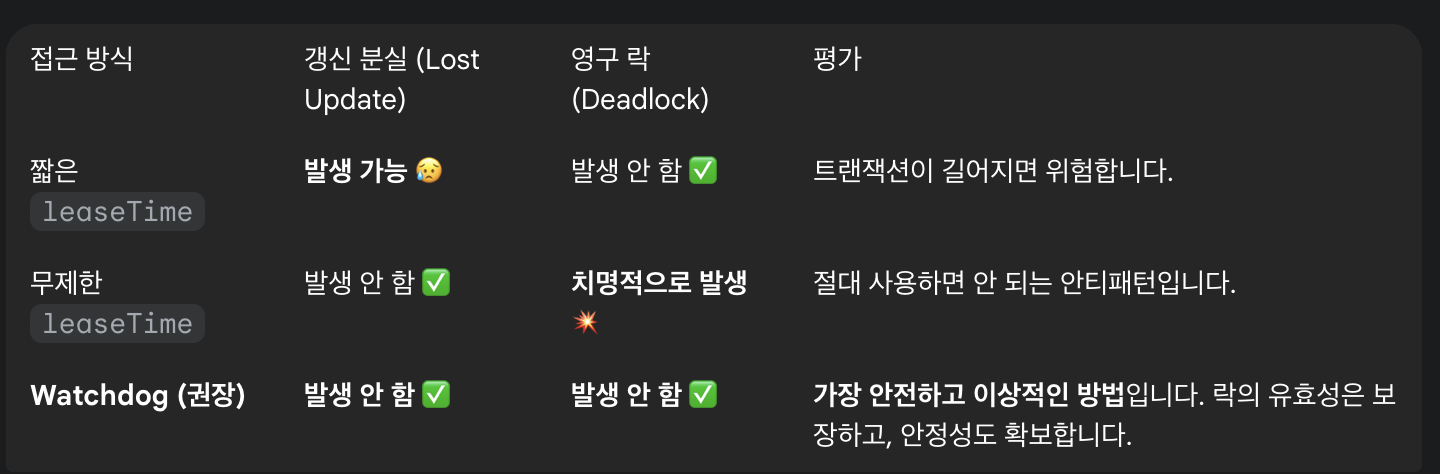 1. 갱신 분실(Lost Update) 문제 : 너무 짧은 leaseTime 또는 예기치 못한 DB 의 지연으로 인한 문제이다.